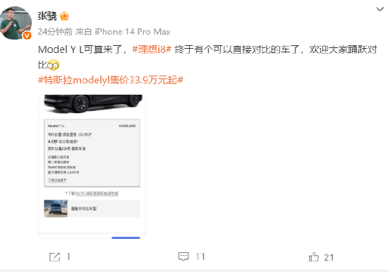 8月19日早间,微博认证为生机汽车 产物线认真东谈主的博想法骁发微博示意,Model Y L可算来了,#生机i8# 终于有个不错径直对比的车了,接待全球奋勇对比[并不简便]