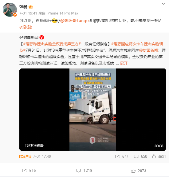 值得驻扎的是,此前在生机汽车i8与重卡对撞测试争议中,更名高管曾示意,“直播(对撞)齐行。”